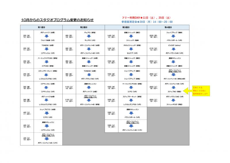 10月のスタジオスケジュール変更/フリー利用DAYの案内について