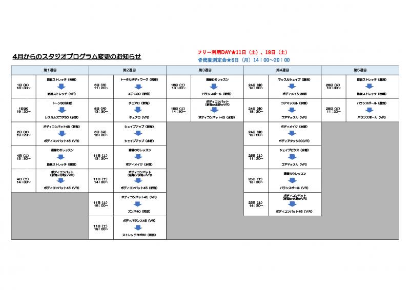 4月のスタジオスケジュール変更/フリー利用DAYの案内について